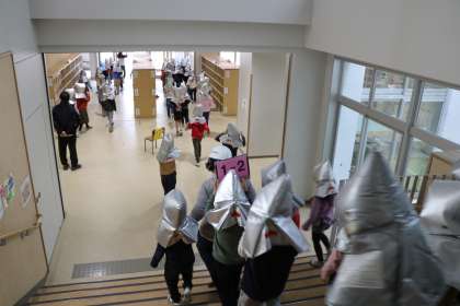 今日は2月の避難訓練です。5時間目が始まったばかりの時間に家庭科室からの火災という設定で、予告なしの訓練です。