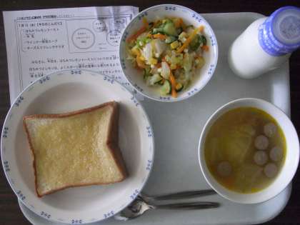はちみつレモントースト・牛乳・ウインナー野菜スープ・チーズ入りフレンチサラダ