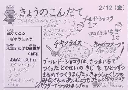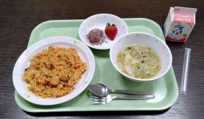 今日のメニューはチキンライス、キャベツスープ、ブール・ド・ショコラ、いちご、牛乳でした。