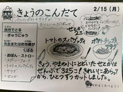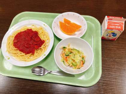 今日は、トマトのスパゲッティ、ポテトチップスサラダ、せとか、牛乳です。