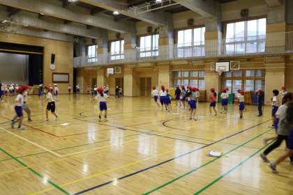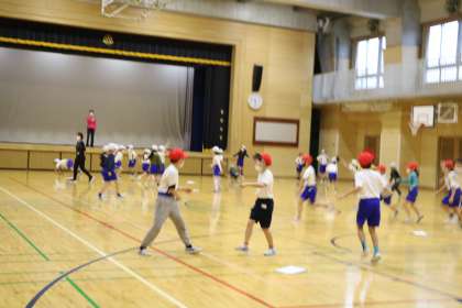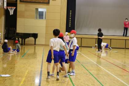「表現・リズムあそび」の様子です。ゆっくりなテンポ、ふつうのテンポ、速いテンポなどいろいろなリズムに合わせて体を動かします。友だちと相談してどんな動きにしようか決めていきます。