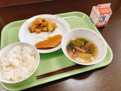 今日は、ごはん、鯖のみそ煮、じゃがいもの煮つけ、沢煮わん、牛乳です。