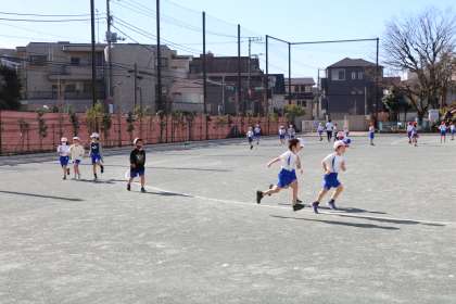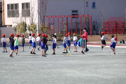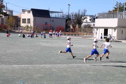 1時間目の校庭では、持久走を授業の初めにやるクラス、やっている間に短縄を練習するクラス。混雑しないよう校庭でも場所を工夫しながら学習します。