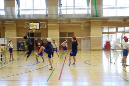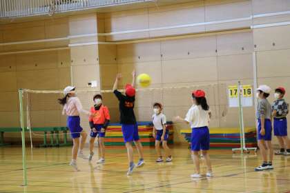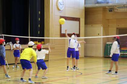 ネット型ゲームのキャッチバレーボールです。空いているところをねらって動いたり、作戦を立てて動いたり、ゲームを通して多くのことを経験しています。どのチームも声を掛け合って協力してプレーしています。