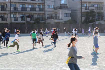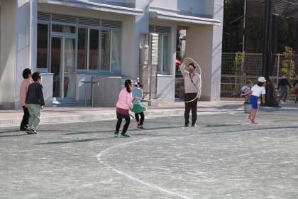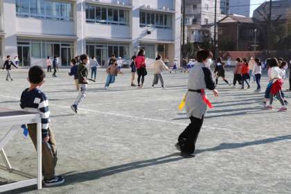 クラス遊びでしっぽとりをやったり、長縄をやったり、先生も一緒に共遊びです。