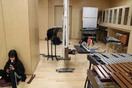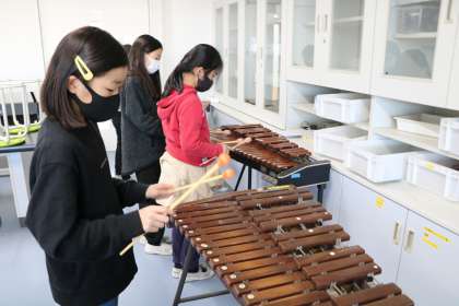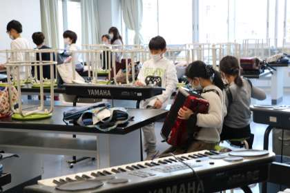 リコーダーの確認を一人ずつしながら、打楽器の合奏パート練習に一生懸命な様子です。