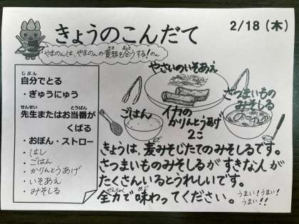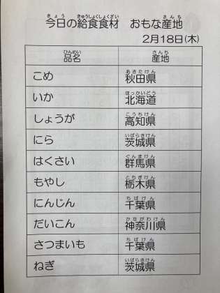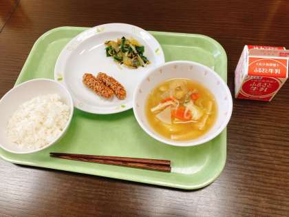 今日は、ごはん、イカのかりんとう揚げ、野菜の磯あえ、さつまいものみそ汁、牛乳です。