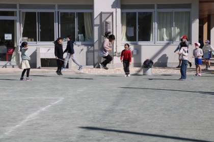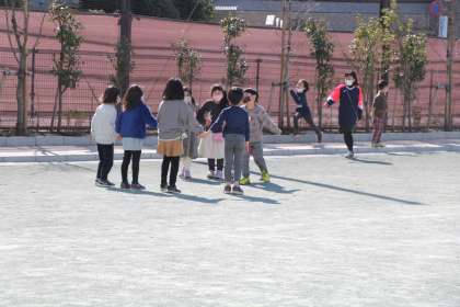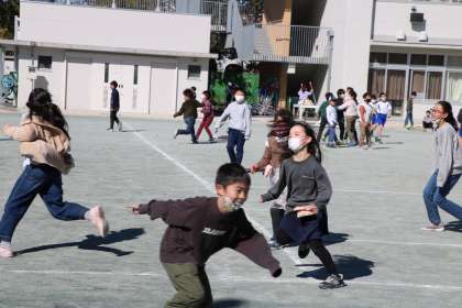 休み時間の校庭は、楽しく遊ぶ低学年の姿がたくさんです。はないちもんめ、鬼ごっこ、長縄では先生が連続跳びに挑戦です!がんばって!