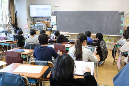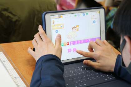 スクラッチというアプリを使って、プログラミングを学習します。テレビモニターには、全員のやっているものを送って提出していく様子も映されています。