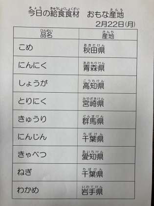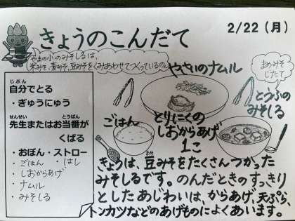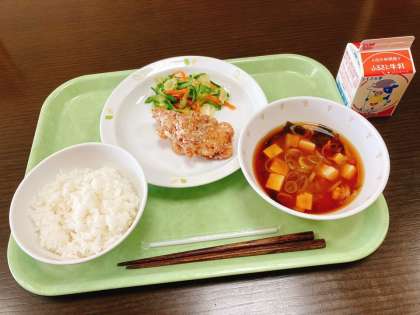 今日は、ごはん、鶏肉の塩唐揚げ、野菜のナムル、豆腐のみそ汁、牛乳です。