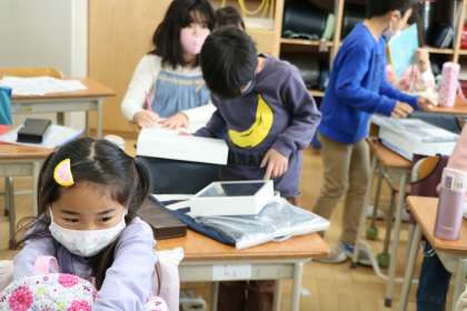 タブレット端末についての話を担任の先生から聞いたあと、一人ずつ受け取ります。