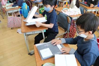使い方など詳細は各学年保護者会でお話しいたします。家に持ち帰りましたら、カバーにはめ込み充電をお願いいたします。