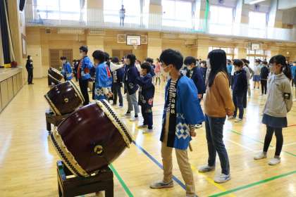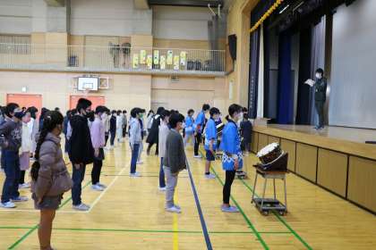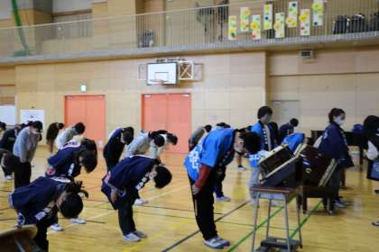 5年生の15分間集中学年練習の様子です。3月4日の「6年生を送る会」の5年生からのプレゼントの練習です。しーんとした体育館の中、太鼓の音だけで気を付け、礼、パーカッション演奏の開始と進んでいきます。5年生の真剣な顔に、演奏の前からドキドキしてしまいます。