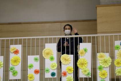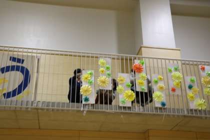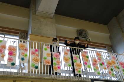 放課後の体育館では4・5年の担任の先生と図工の先生たちが取り付け作業をがんばっています。子どもたちが制作した作品です。