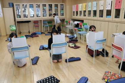 エバリーさんに負けないくらい素敵な演奏の、4年生「茶色の小びん」です。パーテーションも活用し、感染対策もしっかり気を付けます。