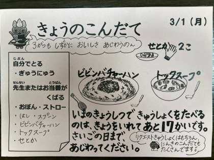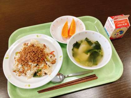 今日は、ビビンバチャーハン、トックスープ、せとか、牛乳です。