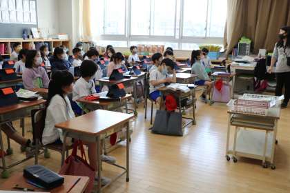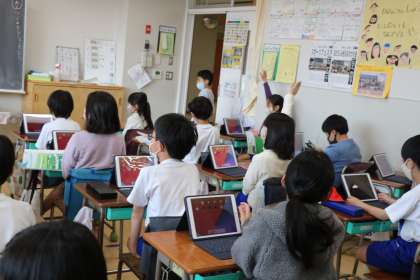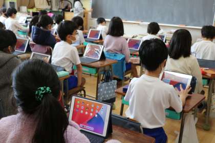 全員のタブレット端末が、インタ−ネットに安定してつながる、Wi-Fi環境になりました。様々な使い方を知り、毎日の学習に生かせるように教員も日々研修を積んでいます。2年生も、先生の話を真剣に聞いて取り組んでいます。