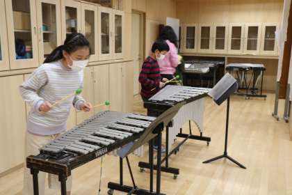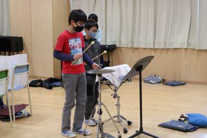 楽器ごとに分かれて練習しています。隣の理科室も使い、密にならないように(音がつられないように?)真剣に練習です。