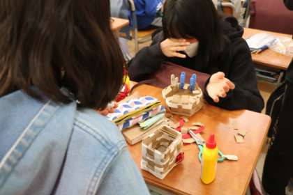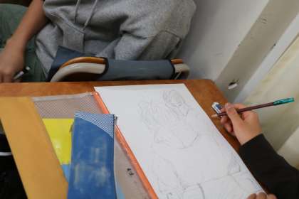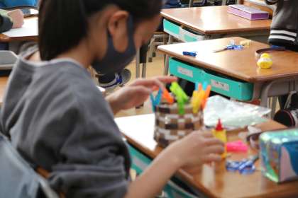 「線が包んだ形」の仕上げです。早く完成した人は、細かい塗り絵に没頭したり、友達の後ろ姿をデッサンしたり、図工の時間を楽しんでいます。