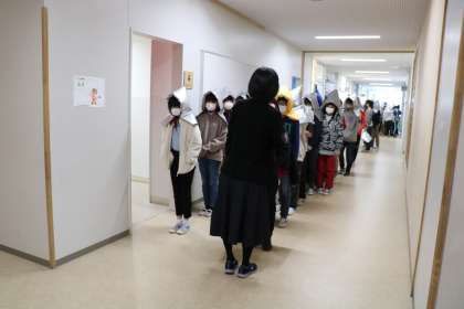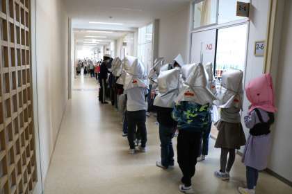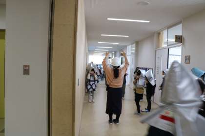 揺れが収まったら廊下に整列して人数と安全を確認します。