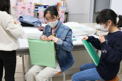 いよいよクッションの仕上げです。ミシンがけが終わり、中綿を入れてかがり縫いをして袋を閉じています。