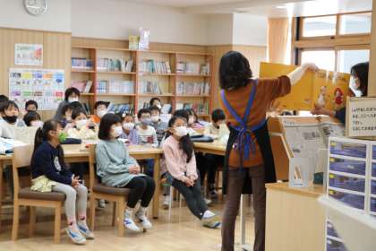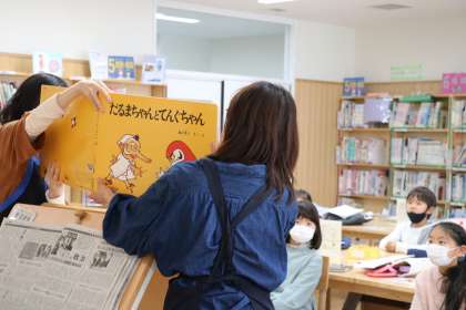 大きな絵本で読み聞かせをしています。子どもたちは絵本の世界にくぎ付けです。
