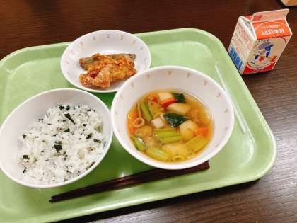 今日は、わかめごはん、ねぎだれから揚げ、のっぺい汁、牛乳です。