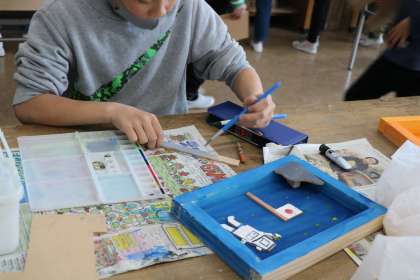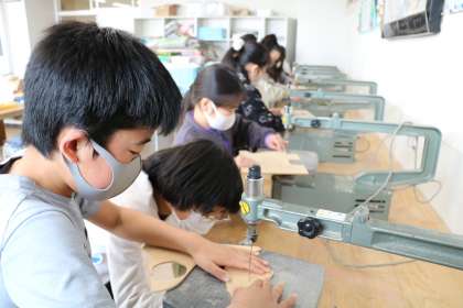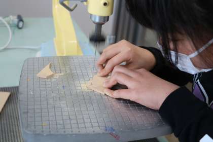 「つくってつかって楽しんで」の作品作りの様子です。糸のこぎりの使い方も上手になってきました。