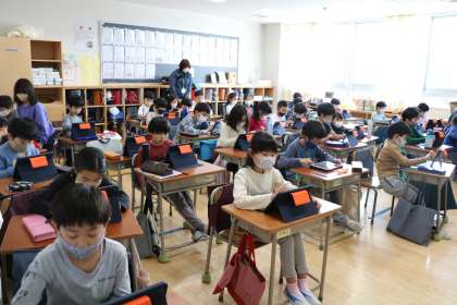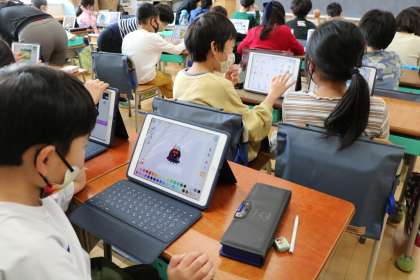 タブレットパソコンを使い、いろいろなアプリを使ってみます。絵を描いたり、絵を動かしたり。子どもたちはいろいろなことに挑戦していきます。正しく使うこともきちんと教えながら今後の学習に生かしていきます。