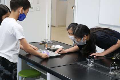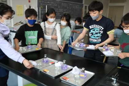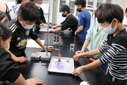 「もののあたたまりかた」の実験の様子です。先生の話をしっかり聞き安全に実験をしています。理科支援の先生と2人態勢で、じっくり実験に取り組みます。