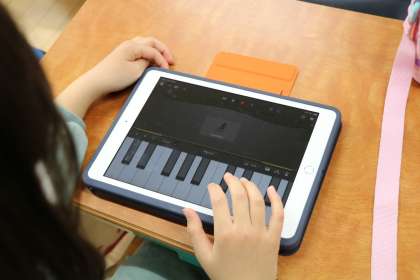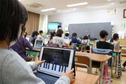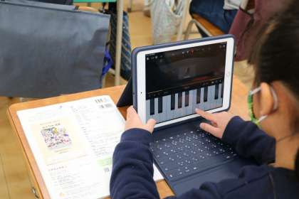 タブレットパソコンで鍵盤の練習をしています。これなら飛沫の心配はないです。子どもたちも音が出せて大喜びで運指の練習をしています。