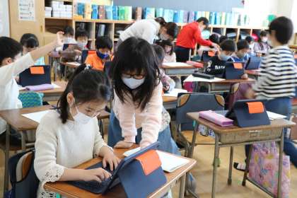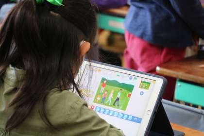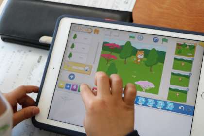 タブレットパソコンで絵を動かしお話を作る学習をしています。プログラミングの一つスクラッチというアプリを使います。順序立てて絵を動かすことは、子どもたちにとって楽しそうです。色を変えたり、手書きの絵を加えたりタブレットを触りながらいろいろなことを発見しています。