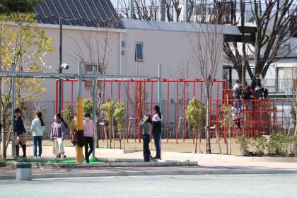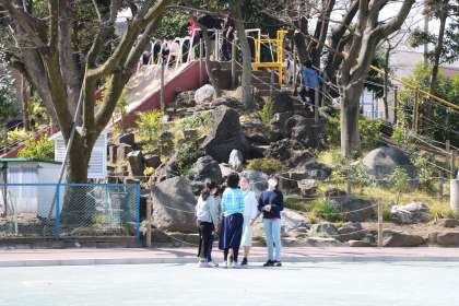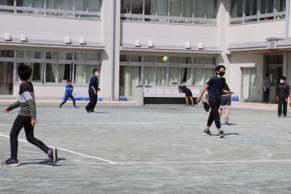 校庭の様子です。先生も一緒にドッジボールを楽しんでいます。