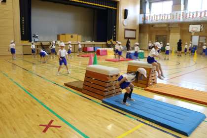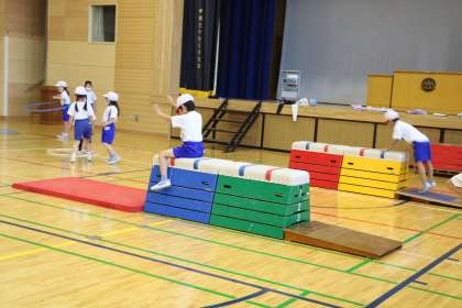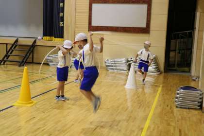 跳ぶ運動を色々な場、色々な道具で挑戦します。