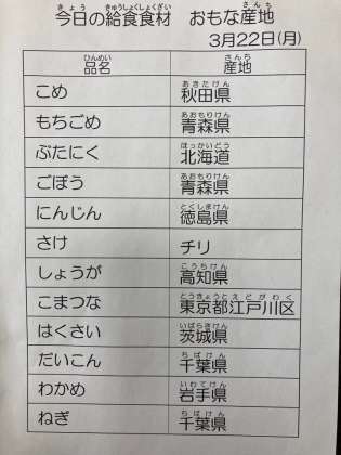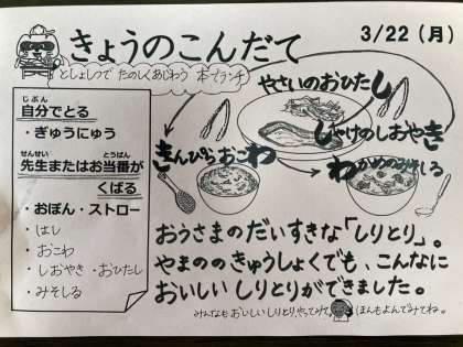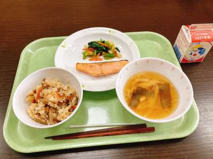 今日は、やさいのおひたし、しゃけのしおやき、きんぴらおこわ、 わかめのみそしる、牛乳です。