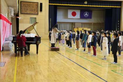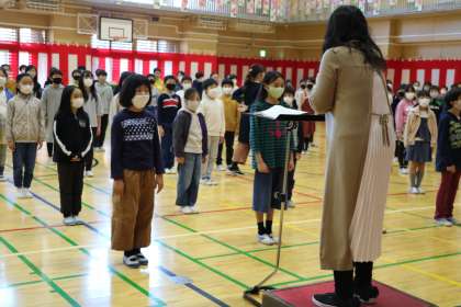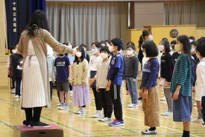 体育館で、「10歳の決意の会」のエンディングに歌を歌いました。いつも学級で小声で歌っていましたが、最後に全員で声を合わせました。もちろんマスクをし、一方向を向き、換気を十分にし、短時間で。