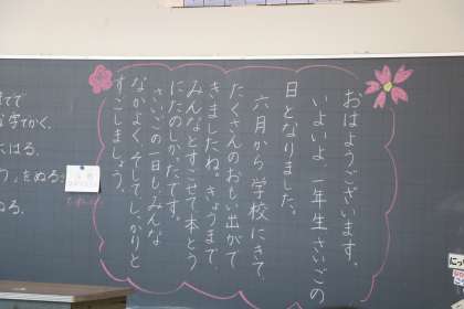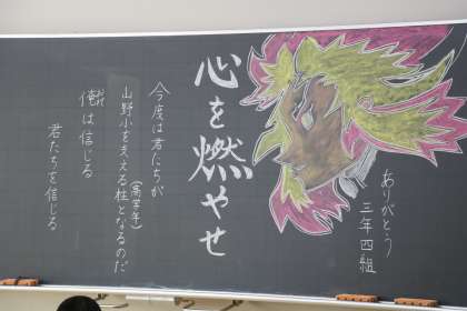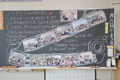 最後の日を迎えるにあたり、担任の先生たちはいろいろな思いで今日の日を迎えます。どんな顔で朝の教室で迎えようか、どんな言葉を子どもたちにかけようか、締めくくりにふさわしい話は、向上心を持って進級してほしい、クラス替えなど不安を持たないで始業式に来てほしい…そんな思いを、黒板に書いたり、学級通信に書いたり、ことばで伝えたり、伝え方も様々です。