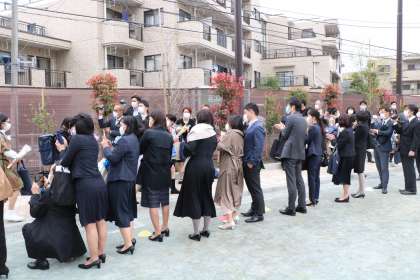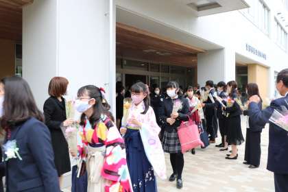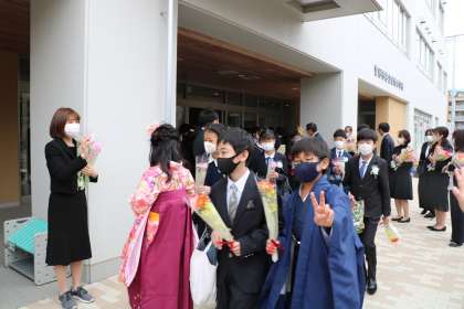 校庭に花道をつくり、みんなで6年生を送り出しました。