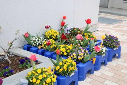 新1年生の入学を楽しみに待つかのように、校舎北側・2グラ側の桜や、1年生が育てたチューリップ、ビオラが満開です。