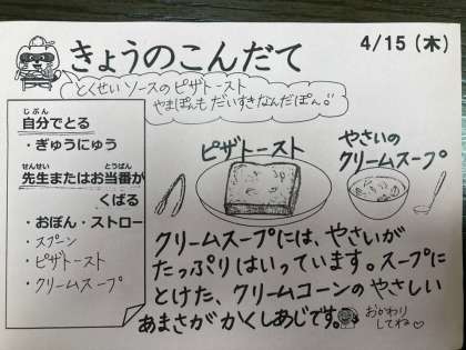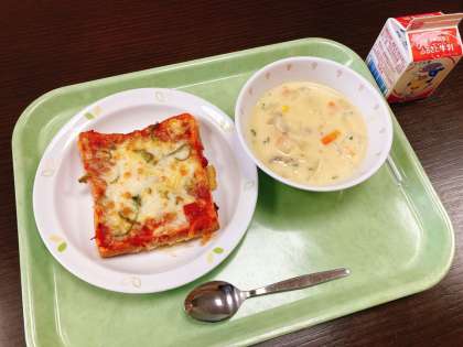 今日は、ピザトースト、やさいのクリームスープ、牛乳です。