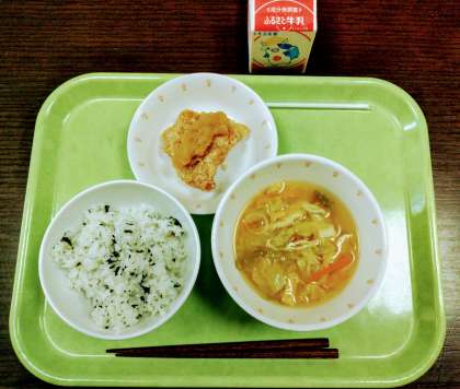 きょうは、わかめごはん、とりにくのからあげみぞれだれ、はるきゃべつのみそしる、ぎゅうにゅうです。