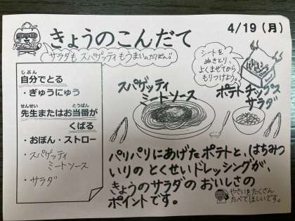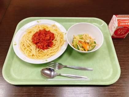 今日は、スパゲッティミートソース、ポテトチップスサラダ、牛乳です。