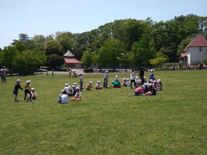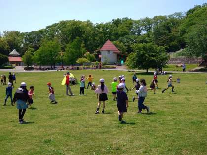 牧場などを見学した後、自由広場でクラス遊びをしました。ほかの学校が来ていなかったので、あちこちに広がって、思いっきり体を動かすことができました。