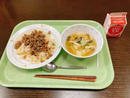 今日は、そぼろごはん、じゃがいものみそ汁、牛乳です。