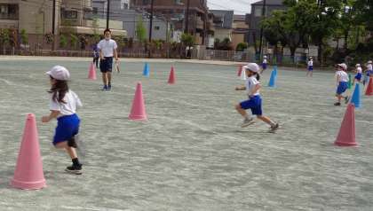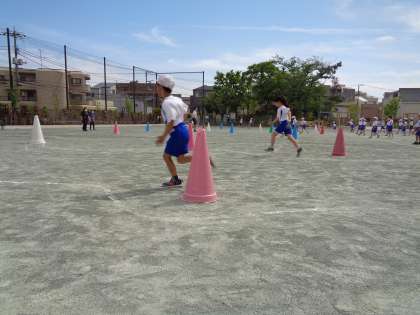 曲がった線の上を走ったり、コーンを左右にかわして走ったりしながら、走るときの体の使い方を学習しました。走るこつの発表では、「カーブで体重を片足にのせます。」「スピードを調節して走ります。」など、スピードにのってうまく走るにはどうしたらよいか考えていました。走り方が上達した子がたくさんいました。