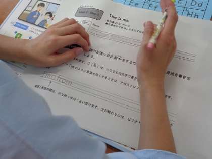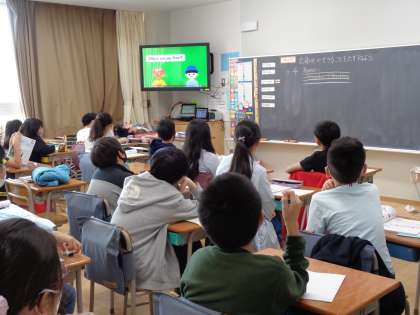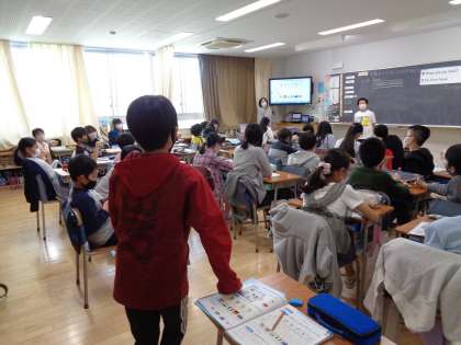 これまでに学習したことを思い出しながら、友達に質問したり、答えたりしました。高学年は書く活動も取り入れ、文字に慣れ親しみます。