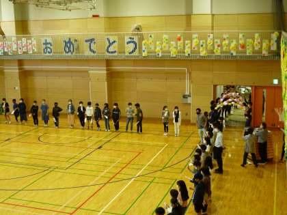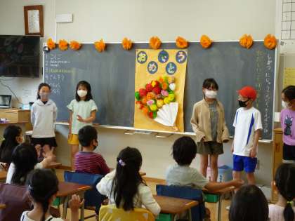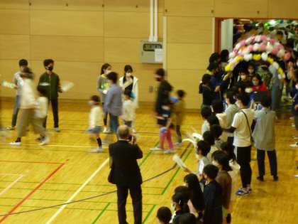 今日は、全校で「1年生を迎える会」を行いました。朝、6年生が1年生の教室に出向き、すてきな花束の模造紙をプレゼントに渡していました。3時間目には、1年生を6年生が迎えに行き、体育館に連れていきました。会場となる体育館では、5年生が花のアーチとチューリップの絵カード、拍手でお出迎えをしてくれました。