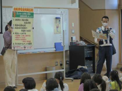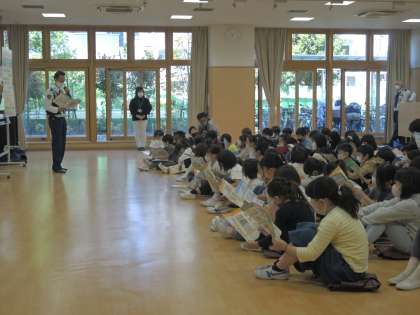 多目的室で、成城警察の方から、正しい自転車の乗り方について、お話を伺いました。ビデオをみた後で、パンフレットに従って大事な所を確認しました。車道の左側を通ることや、いつでも止まれるスピードで走ることなどを勉強しました。