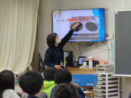 そして、ガスこんろの名称や使い方を教科書をもとに学習しました。テレビの映像を見ながらとても集中して説明を聞きいていました。