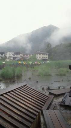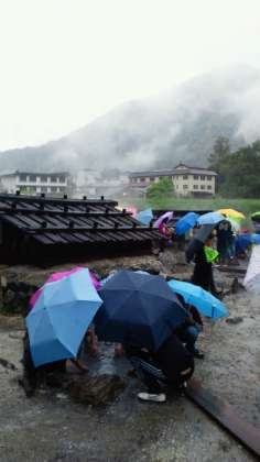 傘をさしての見学です。強い硫黄の匂いがします。雨が小降りになればいいな。